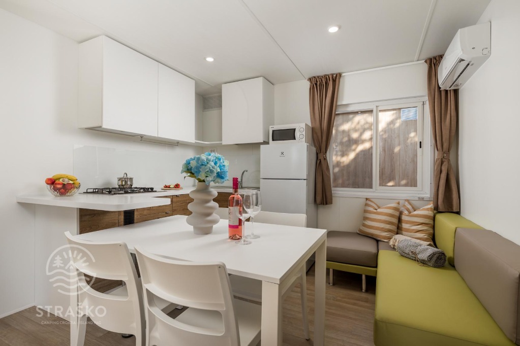 Mobilne kućice Premium: (50 - 100m od mora), klimatizirane, dvije kupaonice, dvije spavaće sobe, kuhinjska niša, mikrovalna pećnica, aparat za kavu, dnevni prostor i blagovaonica, sat tv, terasa.