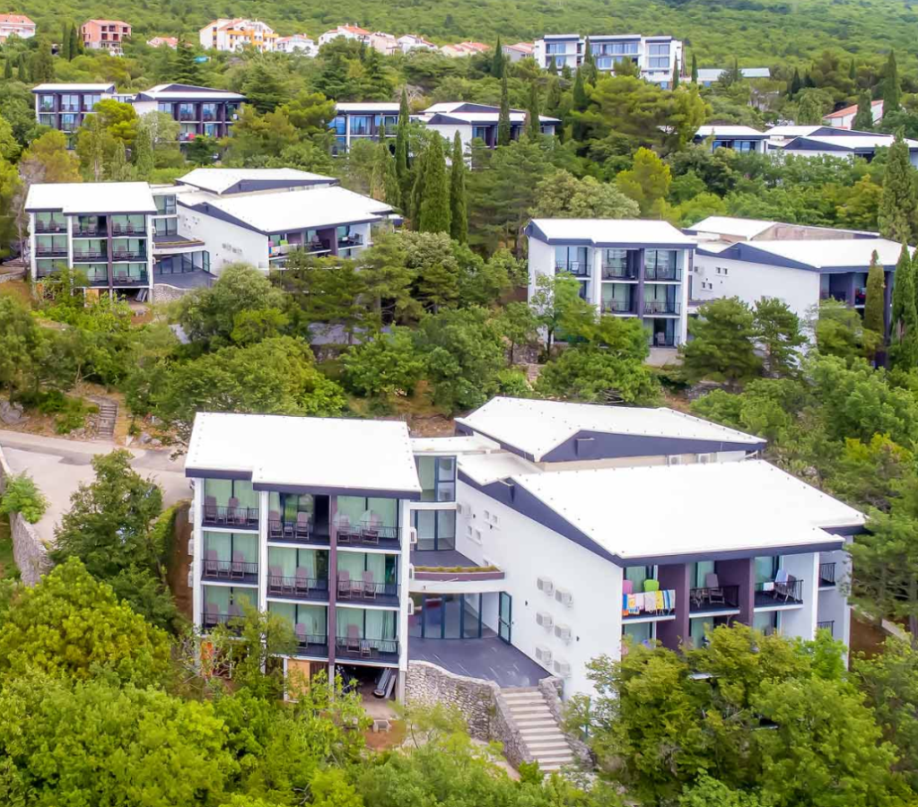 Položaj: naselje okruženo prekrasnom borovom šumom i mediteranskim raslinjem, cca 250-400 m od šljunčane plaže (između cesta), približno 2 km od središta mjesta Crikvenica. Stanica turističkog vlakića u blizini (ispred hotela Omorika, vozi na relaciji Crikvenica - Dramalj - Kačjak u ljetnim mjesecima, uz doplatu)