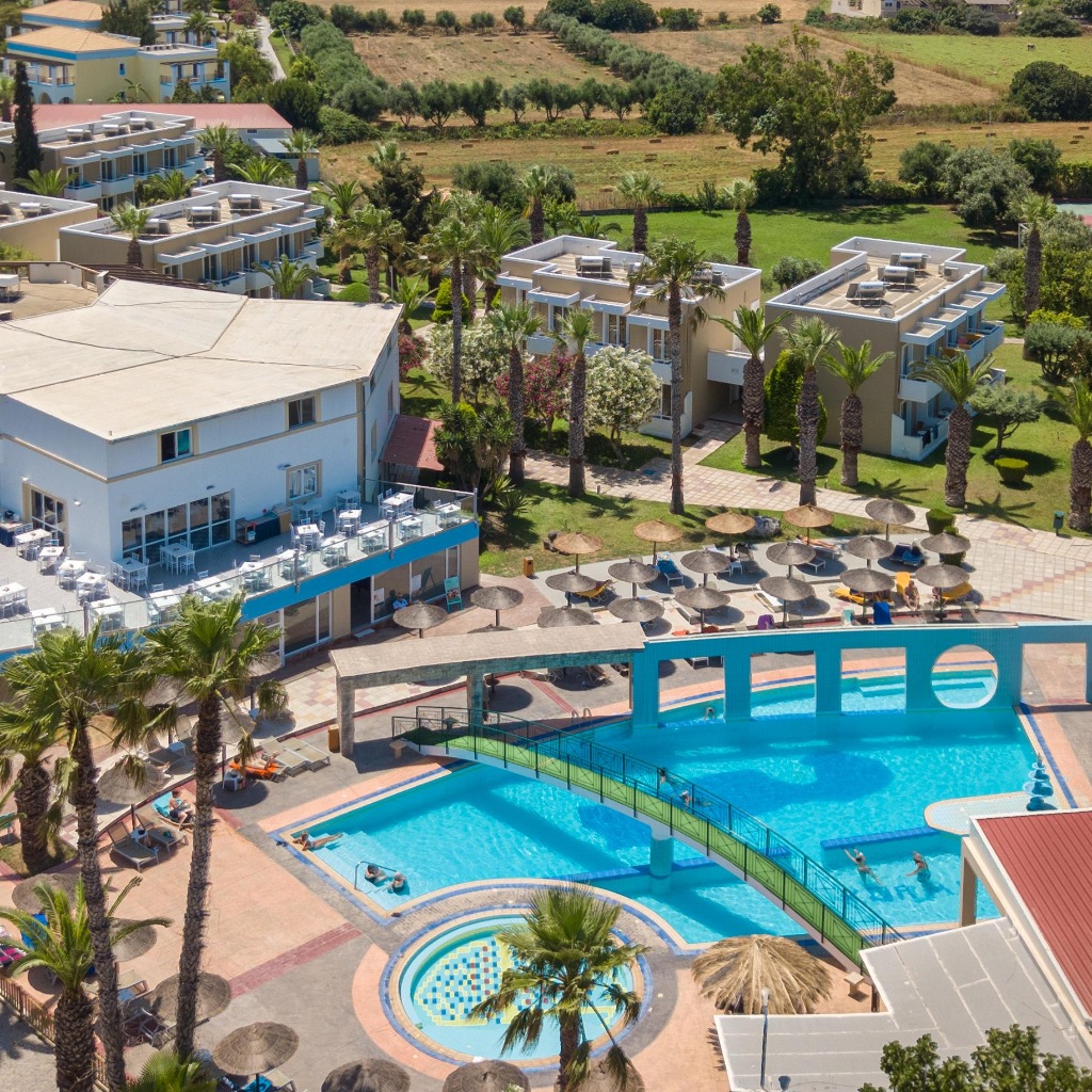 Hotelski sadržaji: hotelski kompleks izgrađen na prekrasno uređenom travnjaku usred nasada, koji se sastoji od jednokatne glavne zgrade i trinaest bočnih zgrada tipa bungalova, ukupno 181 soba (prilagođene i osobama s invaliditetom); restoran, snack bar, bar; dva bazena, dva dječja bazena; trgovina, lift (glavna zgrada), TV kutak, bežični internet na recepciji, parking (ovisno o raspoloživosti).