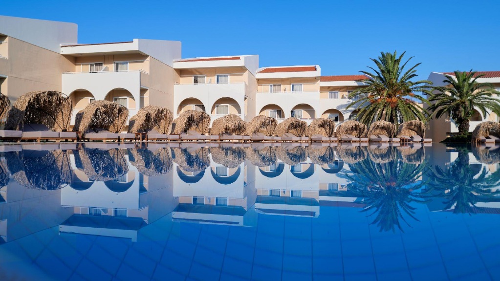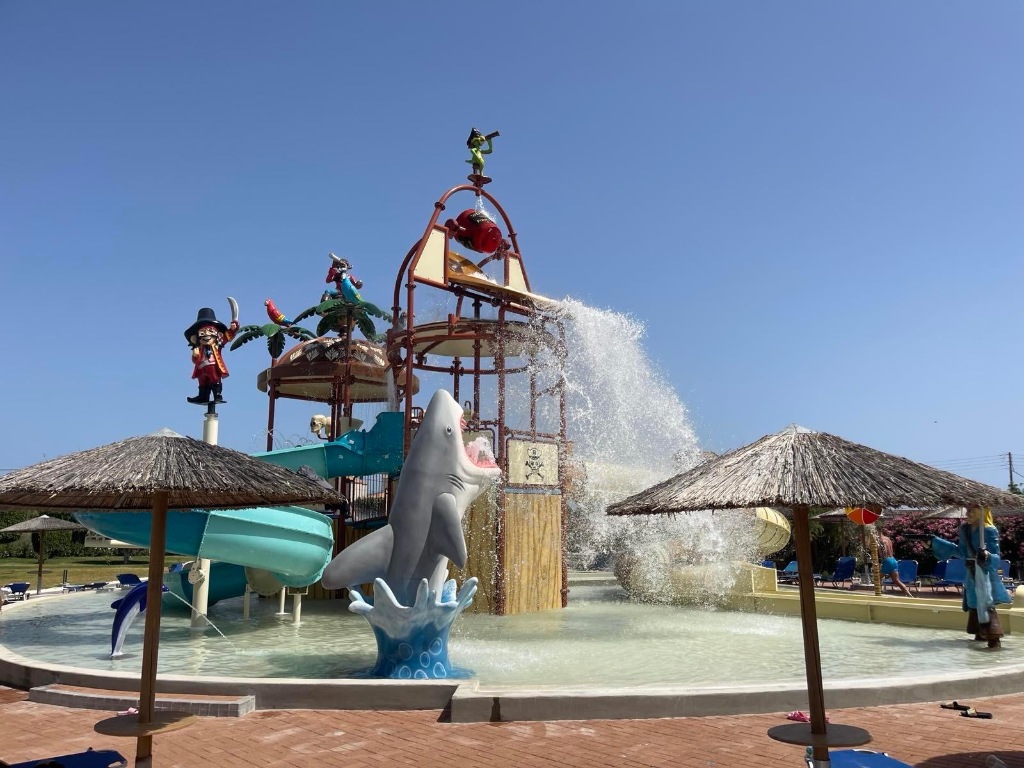 Hotelski sadržaji: hotel okružen prekrasnim vrtom i puno zelenila nudi 197 soba u tri dvokatnice; glavni restoran, grčki "a-la-carte" restoran, bar na recepciji, bar uz bazen, bar na plaži; bazen, dječji bazen, mini vodeni park s tri tobogana i raznim zabavnim atrakcijama u stilu gusarskog otoka; bežični internet; dućan.