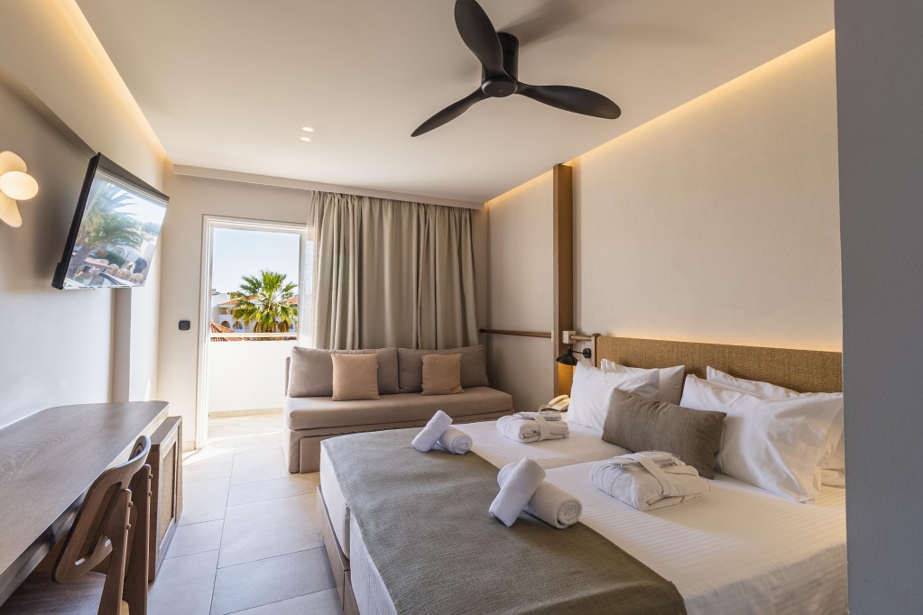 Standard sobe: klima, kupaonica s wc-om, sušilo za kosu, telefon, SAT TV, bežični internet, mini hladnjak, sef, balkon ili terasa, neke bočno prema moru (doplata). Moguć pomoćni ležaj.