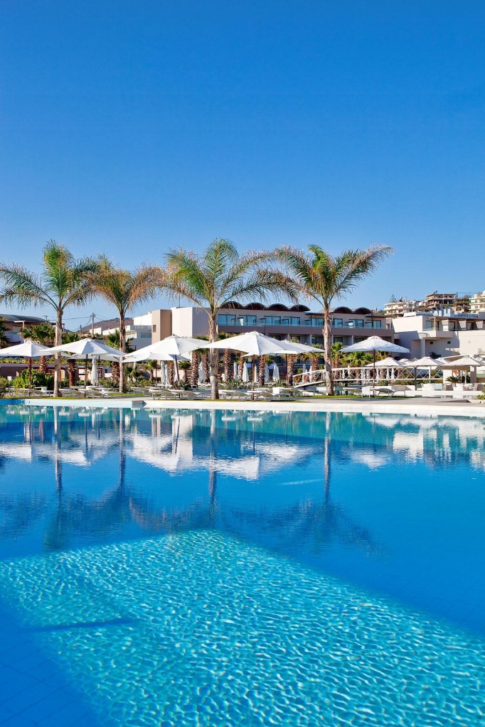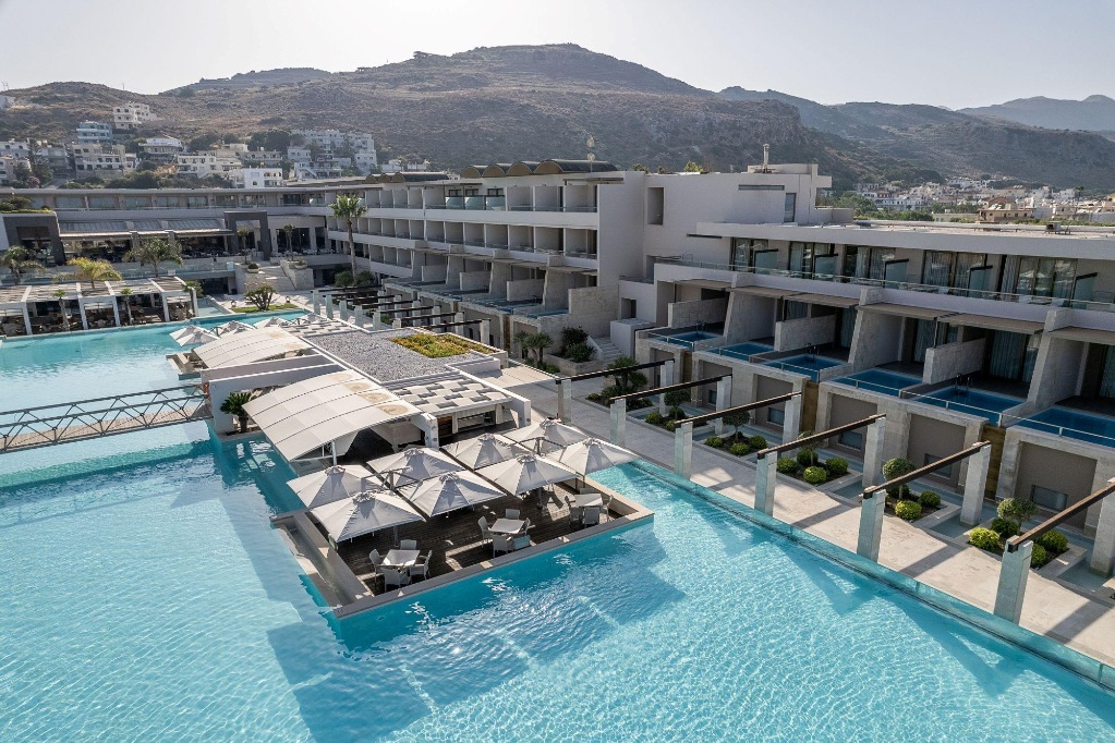 Hotelski sadržaji: dobro održavan hotelski kompleks okružen zelenilom, djelomično renoviran 2025. godine, ukupno 328 soba (uključujući apartmane, sa zajedničkim bazenom, s privatnim bazenom, prilagođeno osobama s invaliditetom); restorani (glavni; grčki, azijski, talijanski, međunarodni "a-la-carte"), snack bar, nekoliko barova, četiri bazena, dječji bazen, grijani unutarnji bazen, trgovina, lift, TV kutak, bežični internet; parkiralište dostupno (ovisno o raspoloživosti).