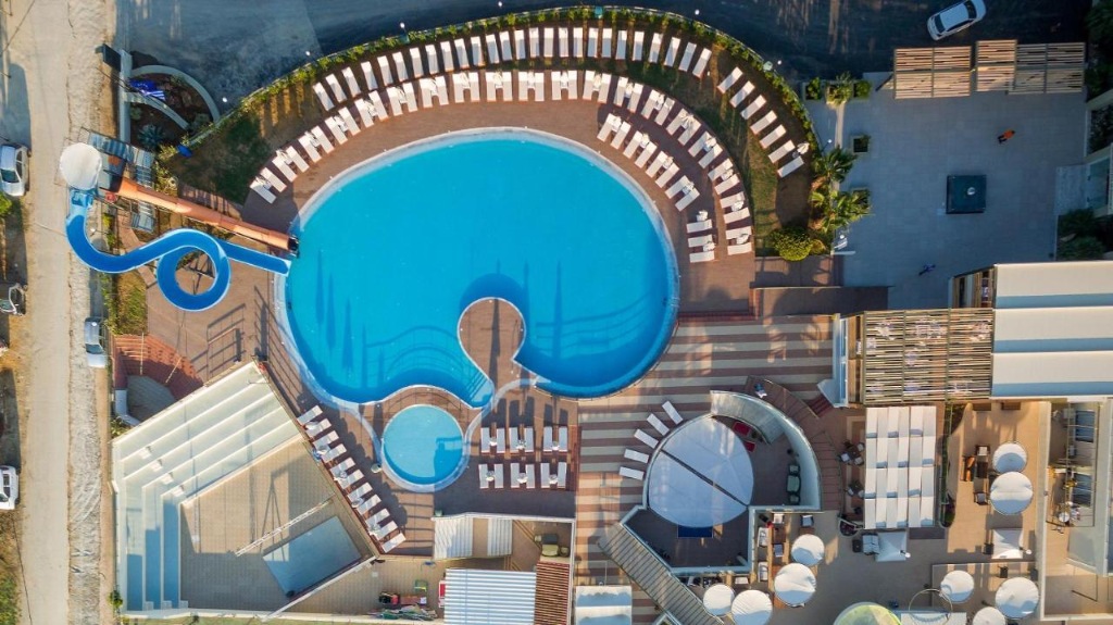 Hotelski sadržaji: veći hotelski kompleks koji se sastoji od glavne zgrade i nekoliko sporednih zgrada tipa bungalova, djelomično renoviran 2023. godine, ukupno 155 soba (uključujući obiteljske sobe, s privatnim bazenom, maisonette); restorani (glavni; mediteranski i riblji "a-la-carte"), nekoliko barova (jedan i na plaži); bazen, dječji bazen, vodeni park; TV kutak, trgovine, bežični internet; parking (ovisno o raspoloživosti).