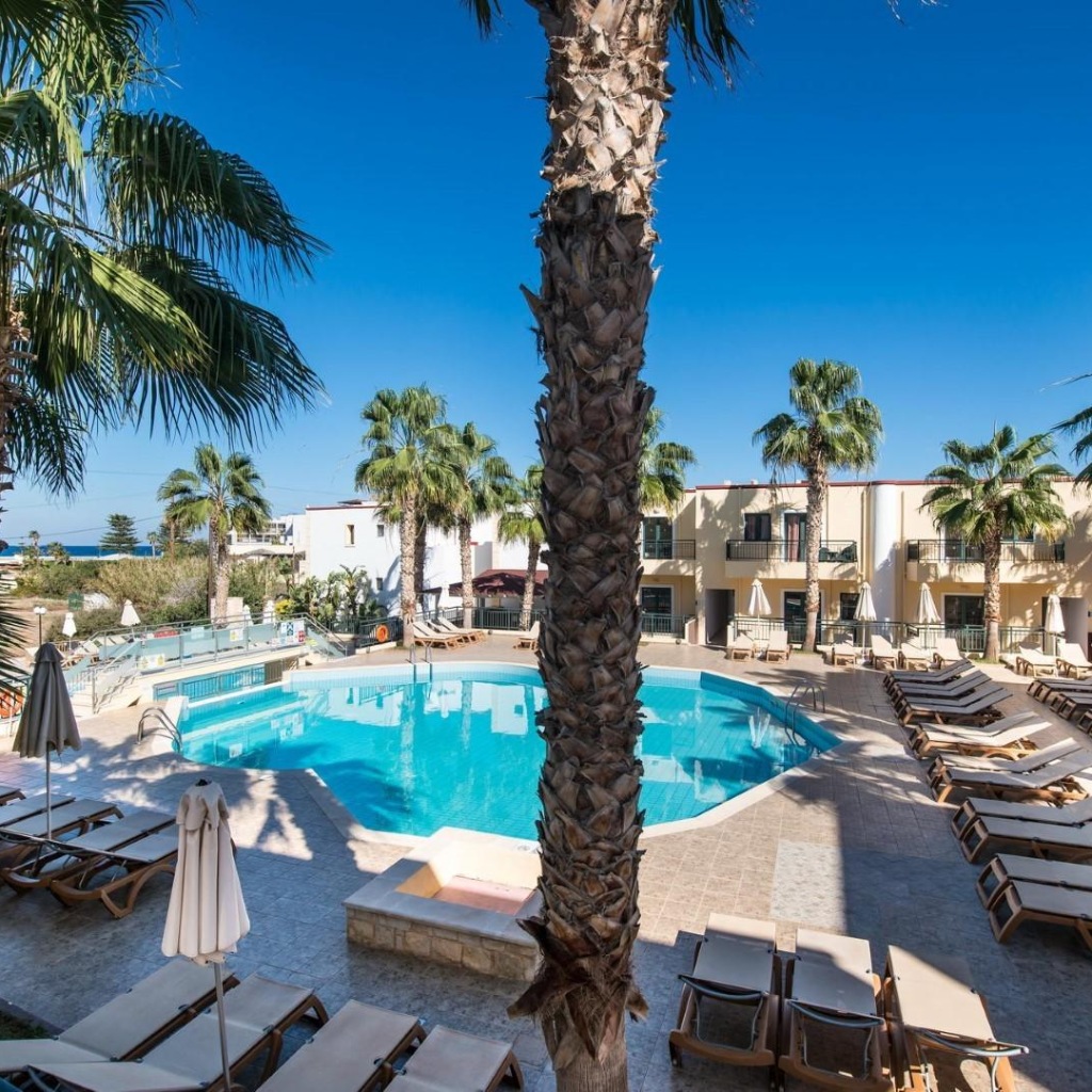 Hotelski sadržaji: hotelski kompleks u dva dijela (pristupna cesta između), djelomično renoviran 2024. godine, ukupno 450 soba (uključujući apartmane sa zajedničkim bazenom); tri restorana (glavni; grčki i azijski "a-la-carte"), tri snack bara, kafić, nekoliko barova (uključujući vinski bar, bar samo za odrasle); tri bazena, dva dječja bazena (jedan s igrama), vodeni park (određeno radno vrijeme); mini market, dizala (određene zgrade), bežični internet; parkiralište dostupno.
