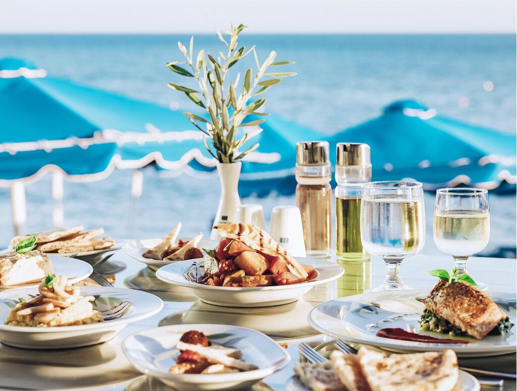 • buffet doručak s grčkim kutkom, ručak i večera u glavnom restoranu, rani kontinentalni doručak; grickalice (također iz bara na plaži), kuglice sladoleda, čajanka;
