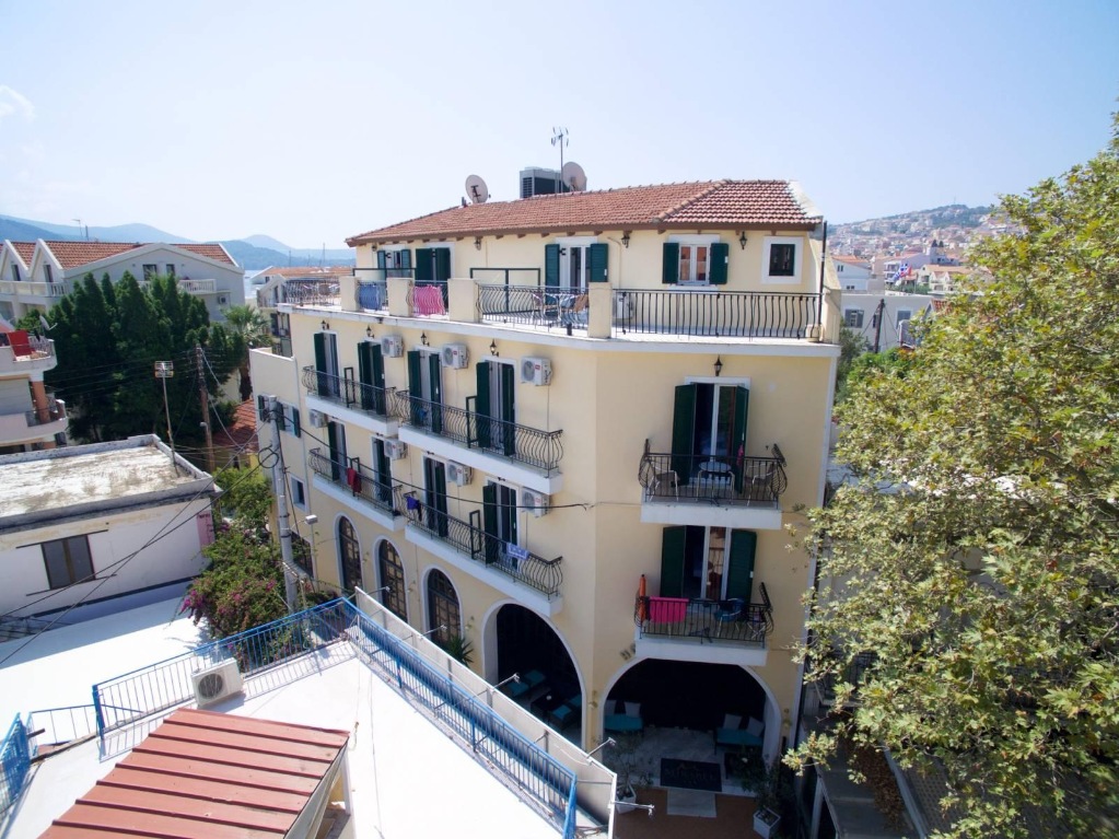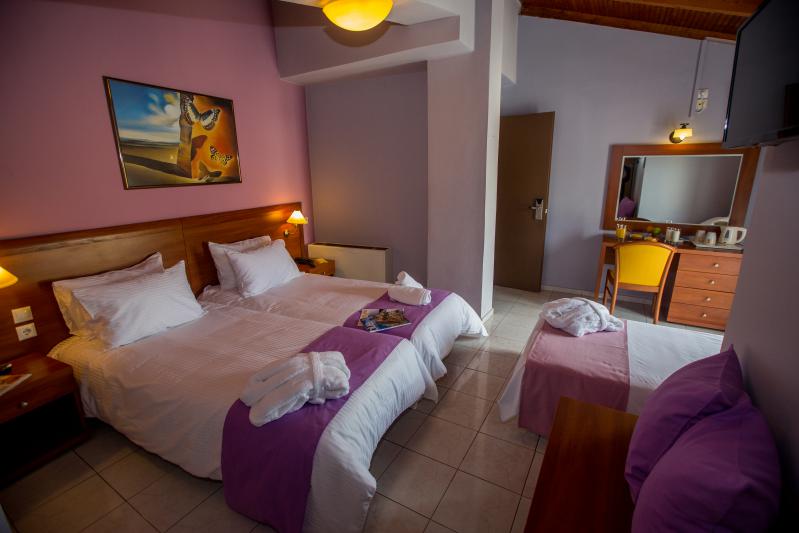 Lokacija: u centru grada (na glavnom trgu), 150 m od glavnog gradskog obalnog šetališta i svih sadržaja, 3 km od najbliže pješčane plaže Makris Gyalos i 6 km od zračne luke. Hotelski sadržaji: hotel na tri kata, ukupno 33 sobe, sala za doručak, bar na recepciji, snack bar; internet kutak (plaćanje), bežični internet.