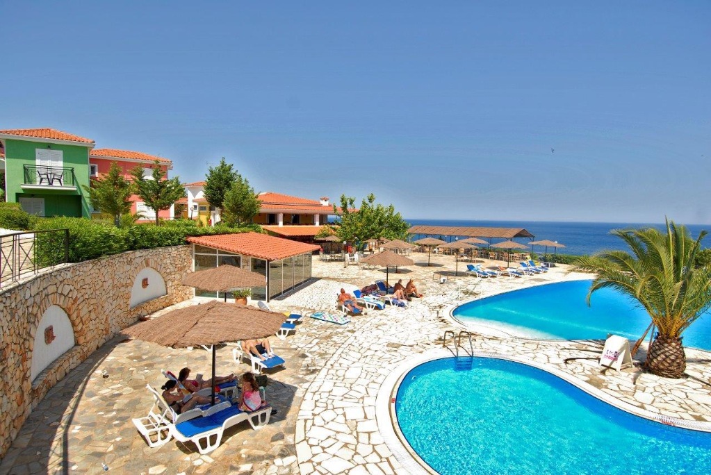 Lokacija: uz malu pješčano-šljunčanu plažu (između je cesta - do plaže vode stepenice), oko 3 km od centra Skale (hotelski minibus besplatan) i 35 km od zračne luke.