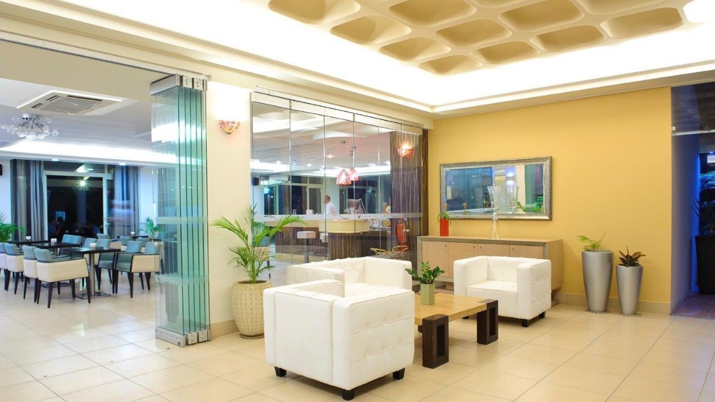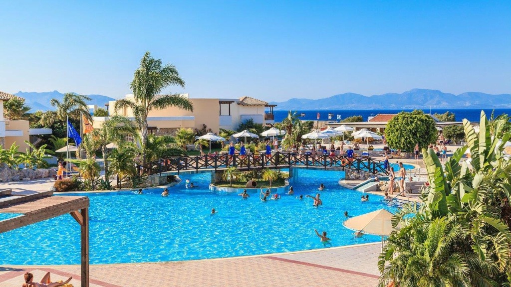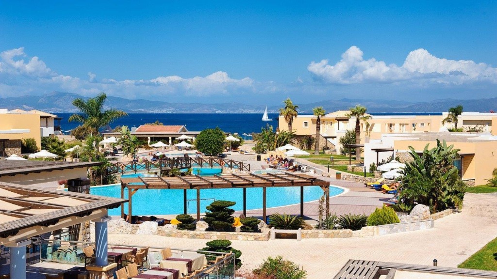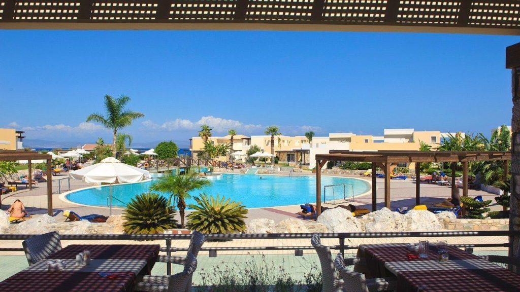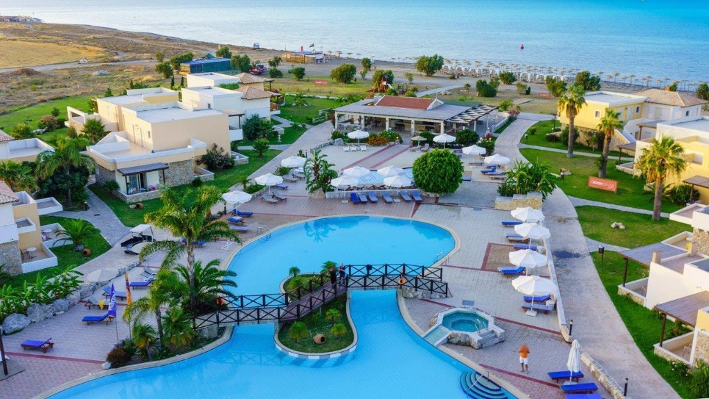 Hotelski sadržaji: moderan hotelski kompleks od 23 niske zgrade, djelomično renoviran 2022. godine, ukupno 176 soba (uključujući sobe s privatnim bazenima, apartmane, prilagođene osobama s invaliditetom); dva restorana (glavni; grčki "a-la-carte"), snack bar, bar; dva bazena, dva dječja bazena, jacuzzi; trgovina, bežični internet.