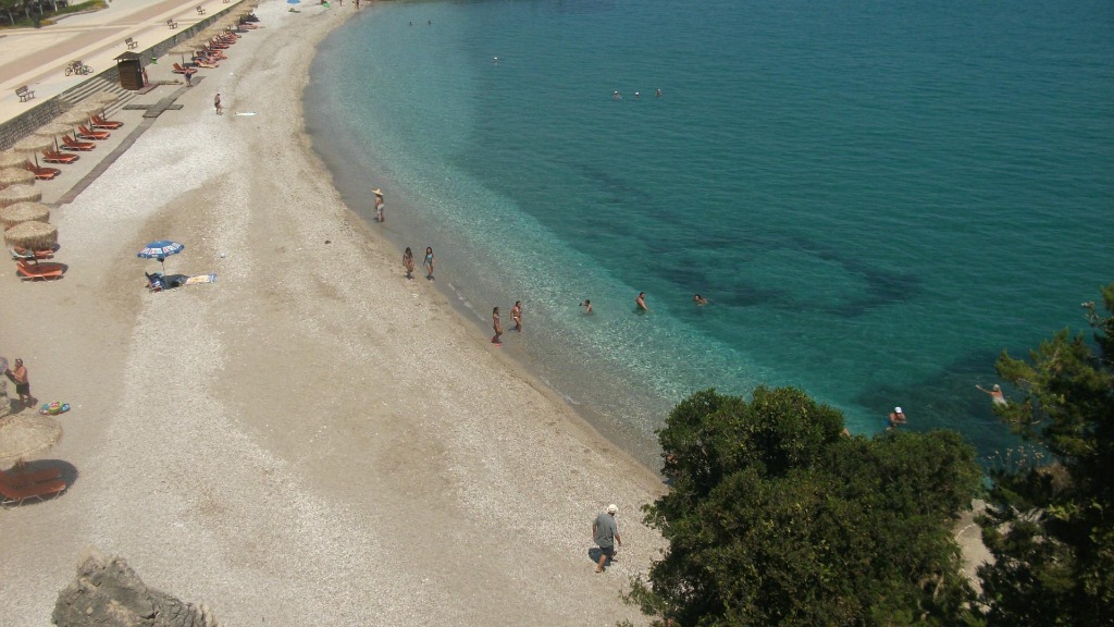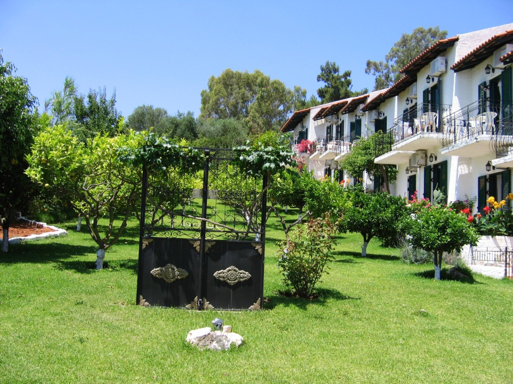 Lokacija: nasuprot šljunčane i pješčane plaže (između je cesta), na periferiji naselja Skala, 40 km od zračne luke.