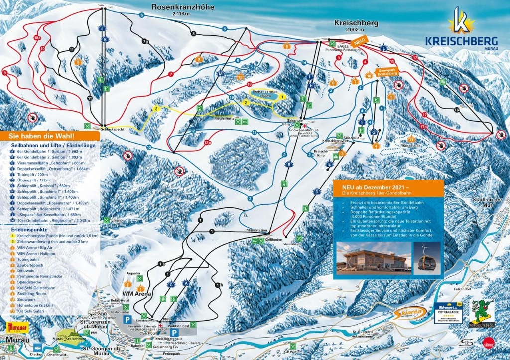 Položaj: naselje se nalazi cca 400 m od donje stanice gondole, 7 km od grada Murau, naselje sa apartmanima i planinskim kućama uređene u alpskom stilu. Mogućnost rezervacije na licu mjesta grijanog spremišta za skije kod gondole, što olakšava odlazak na skijanje i povratak u smještajni objekt